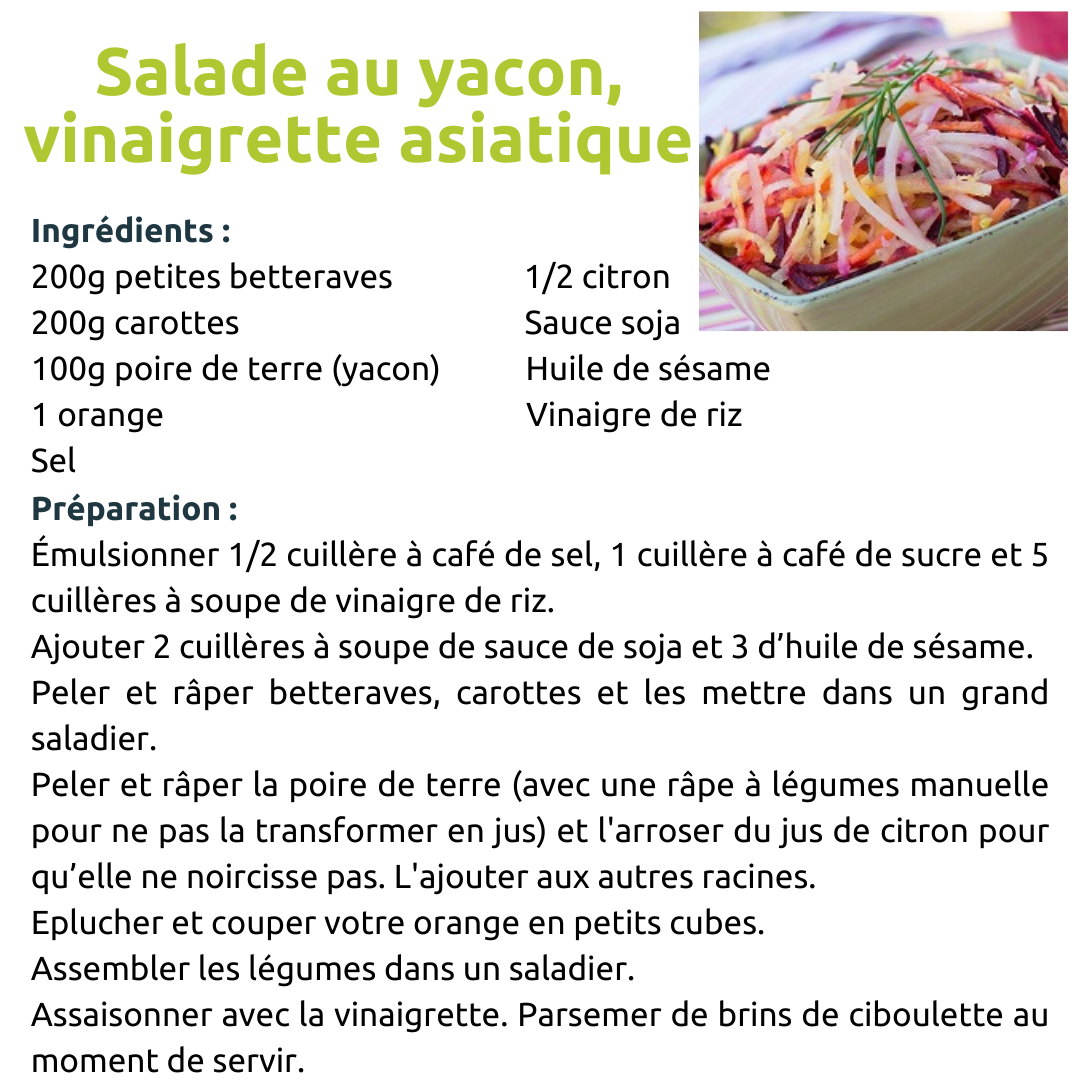 Retrouvez la recette cette salade sur notre site : https://www.lerelaispourlemploi.fr/jardin/recettes/salade-au-yacon-vinaigrette-asiatique/